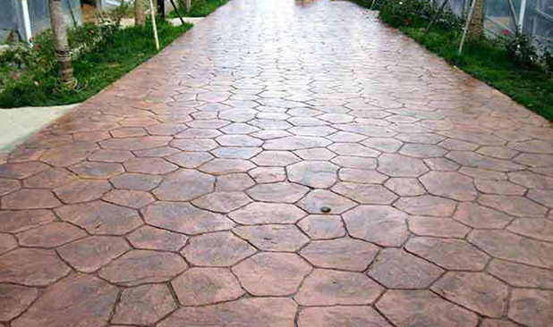 首先要由發包方把藝術地坪外圍用模板設立好,在設立模板高度和設計標高平齊的時候不需要像鋪地板磚那樣預留一定的高度,放置好窨井框或者埋設好地下管線。然后發包方把現場進行混凝土攤鋪,鋪設好并且做好相應的坡度,木哈找平,提漿充分,千萬不要往攤鋪好的混凝土里面參水,要保證混凝土水灰的比例一致,按照順序把混凝土澆到,再交給雅涂彩石藝術地坪施工人員來進行作業。混凝土的表面如果沒有太多水分的時候,就由施工人員撒布彩色的強化料,強化料要撒的均勻,等到藝術地坪的表面變暗了以后,就可以開始撒彩色脫模粉了,脫模粉也是要撒的均勻,模具在放置的時候一定要準確無誤。做完這些就可以測試夯實程度了,壓印的紋路一定要均勻,并且要注意這條施工的道路較起碼要封閉一天以上。冬天較起碼要3天以上。